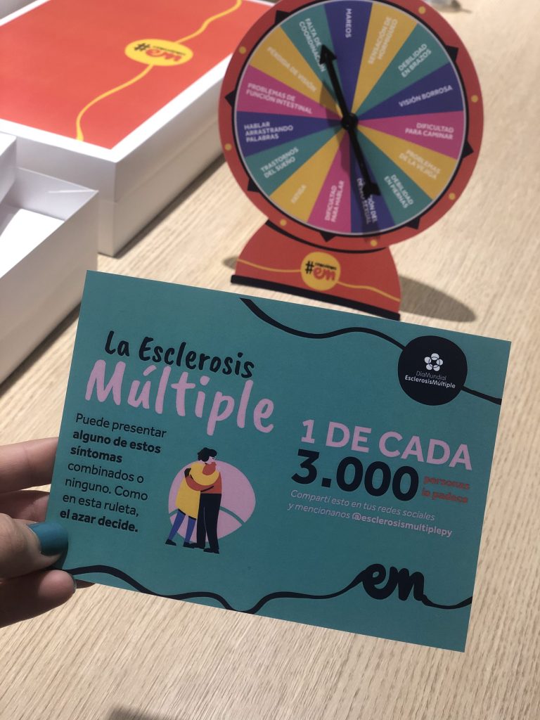 El Kit estuvo conformado por una caja que contenía: una ruleta con las diferentes manifestaciones de la EM, una tarjeta explicativa invitando a la difusión y un flyer dando claridad sobre ciertos mitos que existen de la enfermedad.